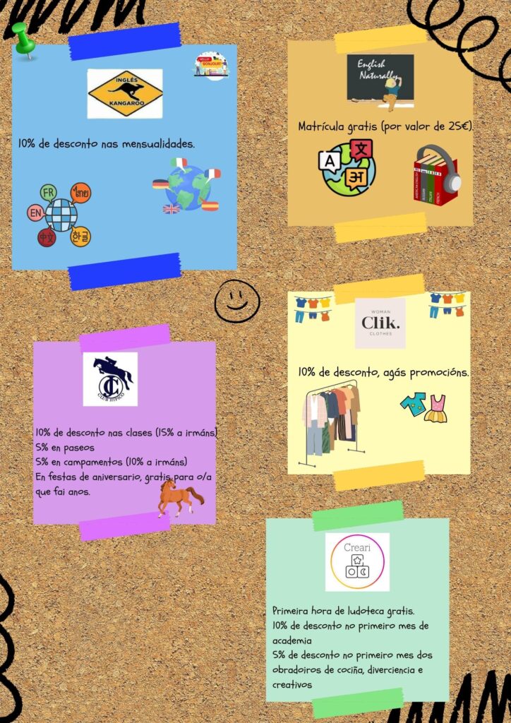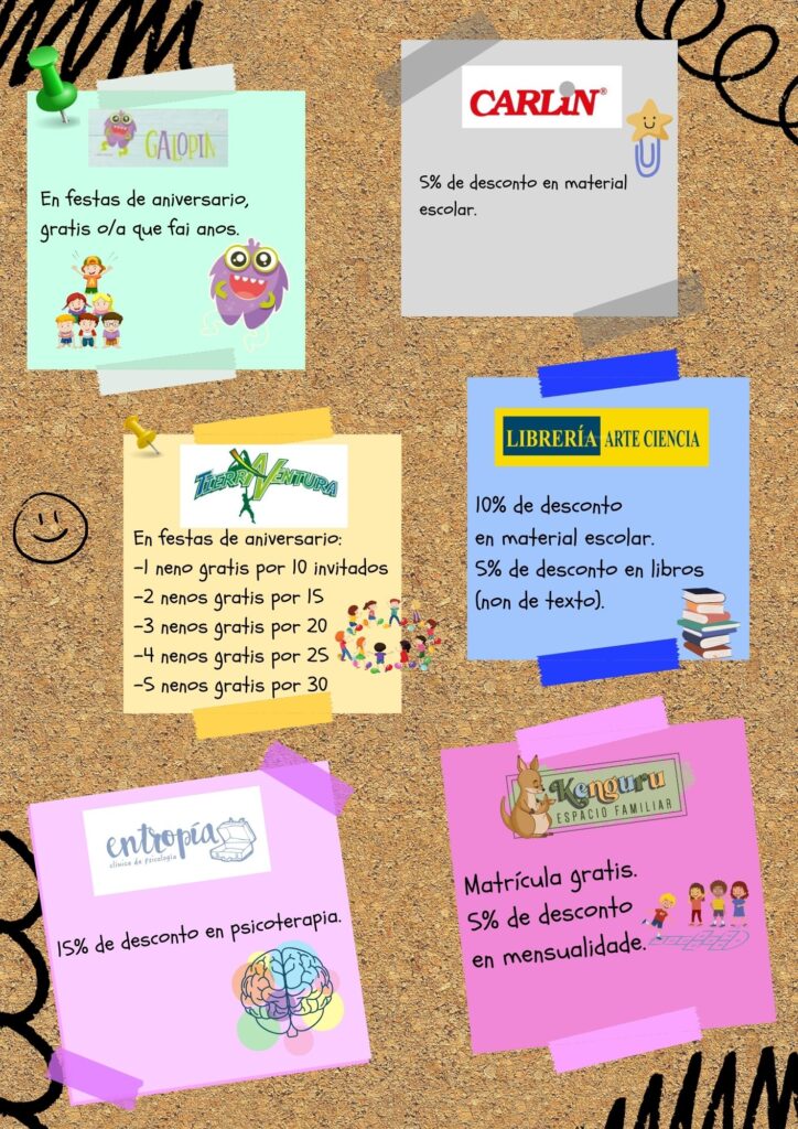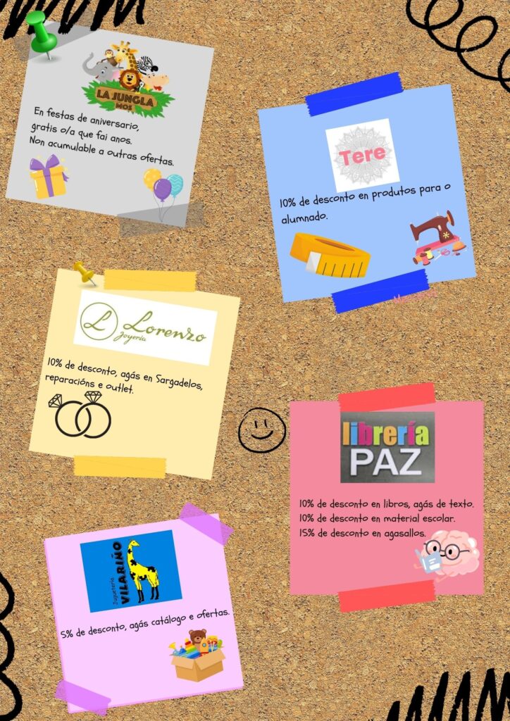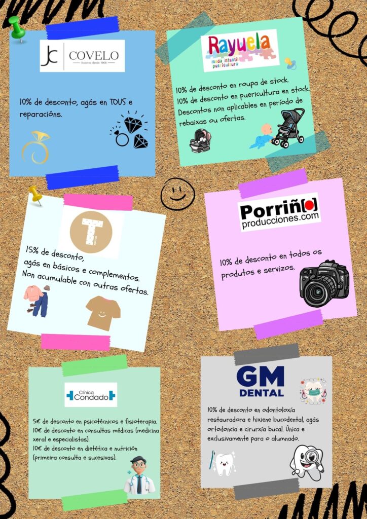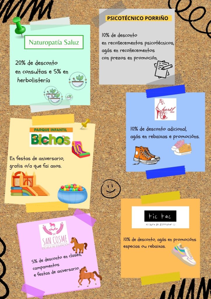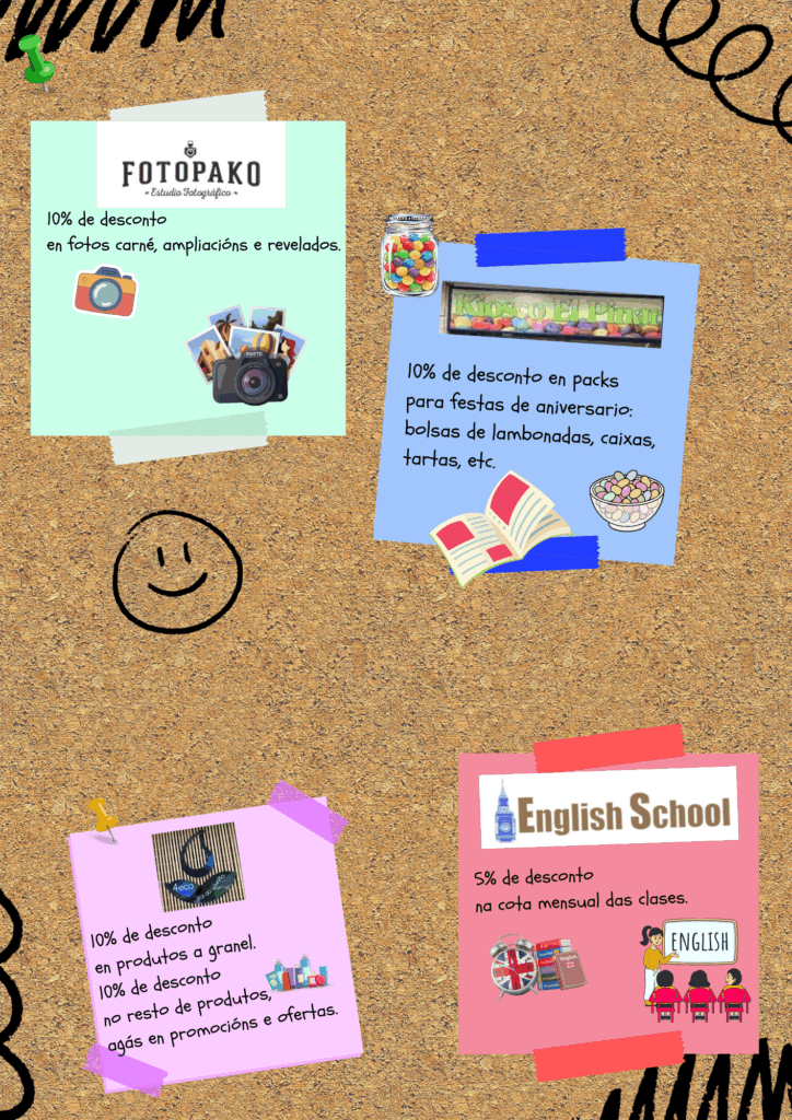 - O establecemento non está obrigado a ofrecer o desconto se non se presenta o carné de socio/a. Ademais, poderá requirir o DNI do pai/nai/alumno/a para corroborar os datos.